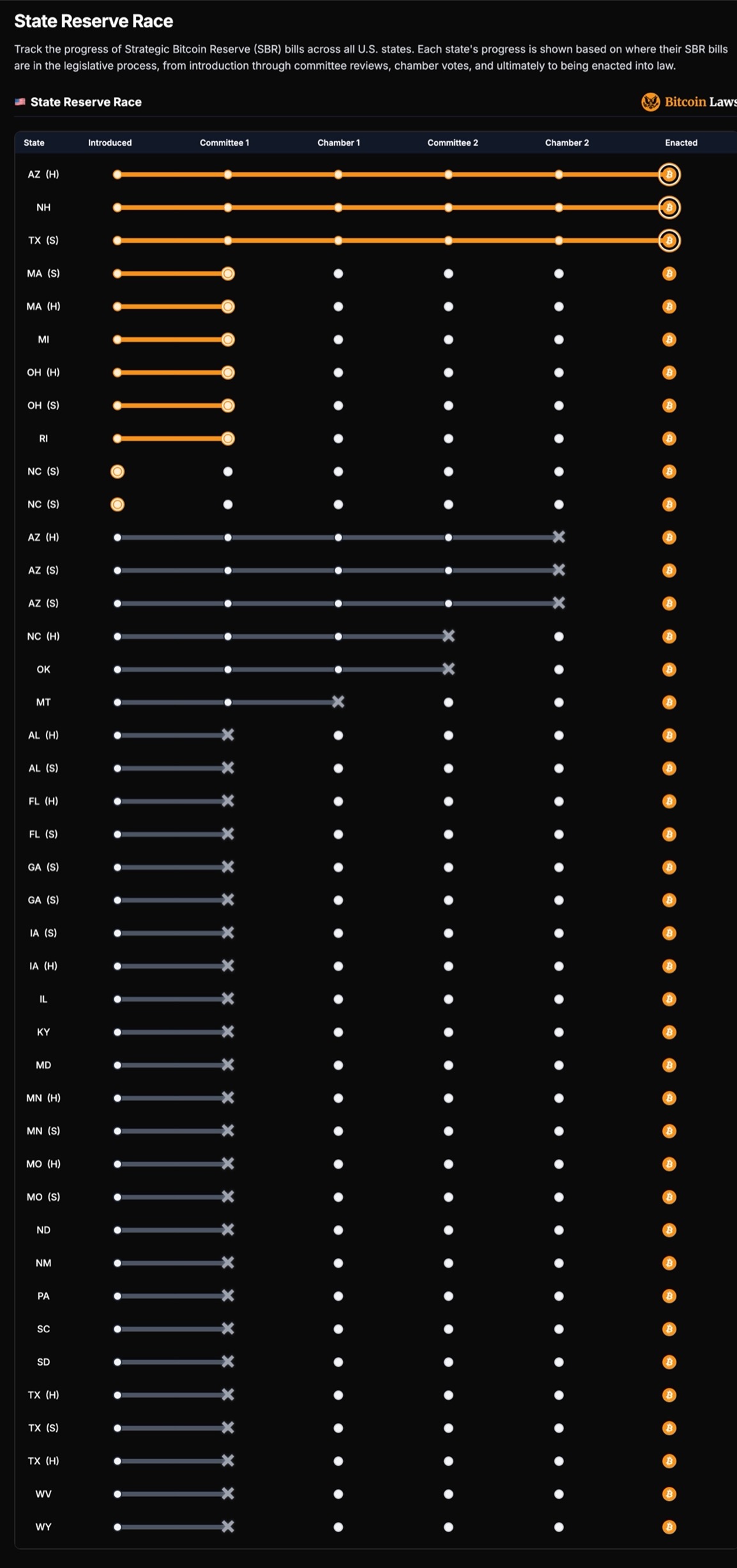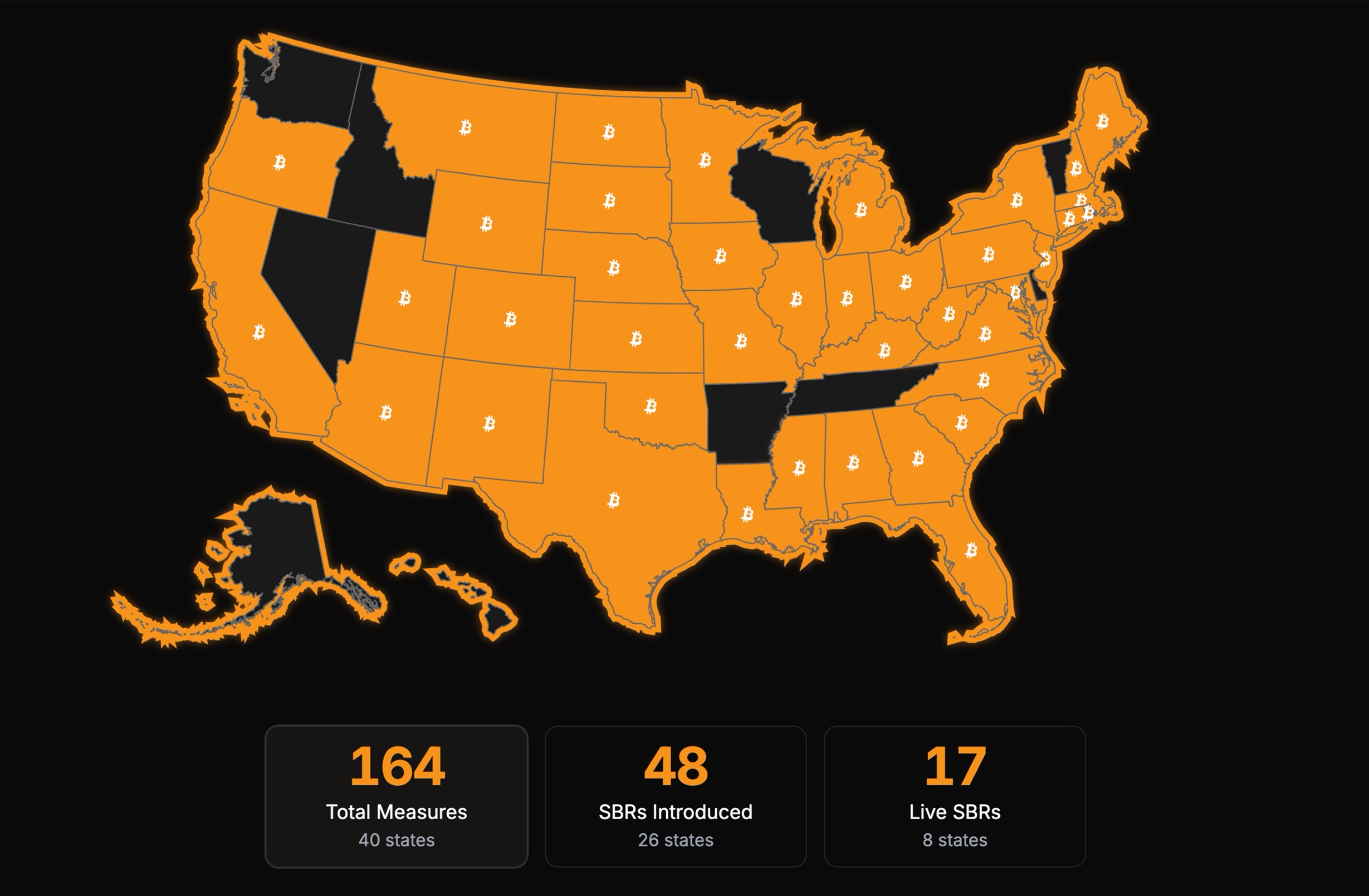 此外,在州一级层面,各州也在积极推动相关立法。Bitcoin Laws 披露数据显示,截至撰文,全美已有40个州提出164项数字资产相关立法措施,其中48项涉及「州比特币储备」(State Bitcoin Reserve)。其中有17项储备法案正在推进或已完成立法程序。目前,已通过比特币储备法案的州包括德克萨斯州(SB21)、新罕布什尔州(HB302)和亚利桑那州(HB2749)。