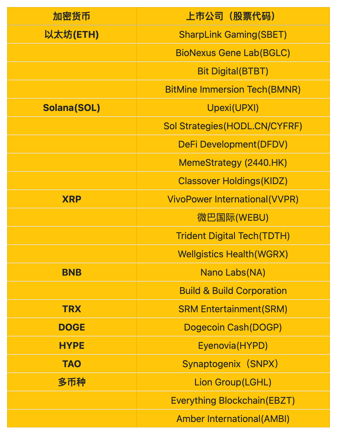 除了比特币,目前这场加密货币储备竞赛也已从最初的比特币单一资产逐渐扩展到以太坊、SOL、XRP、BNB、TRX 等主流代币,甚至包括 HYPE、TAO、DOGE 等。这种转变反映出企业正在根据自身业务特点和市场需求,构建差异化的数字资产储备体系。