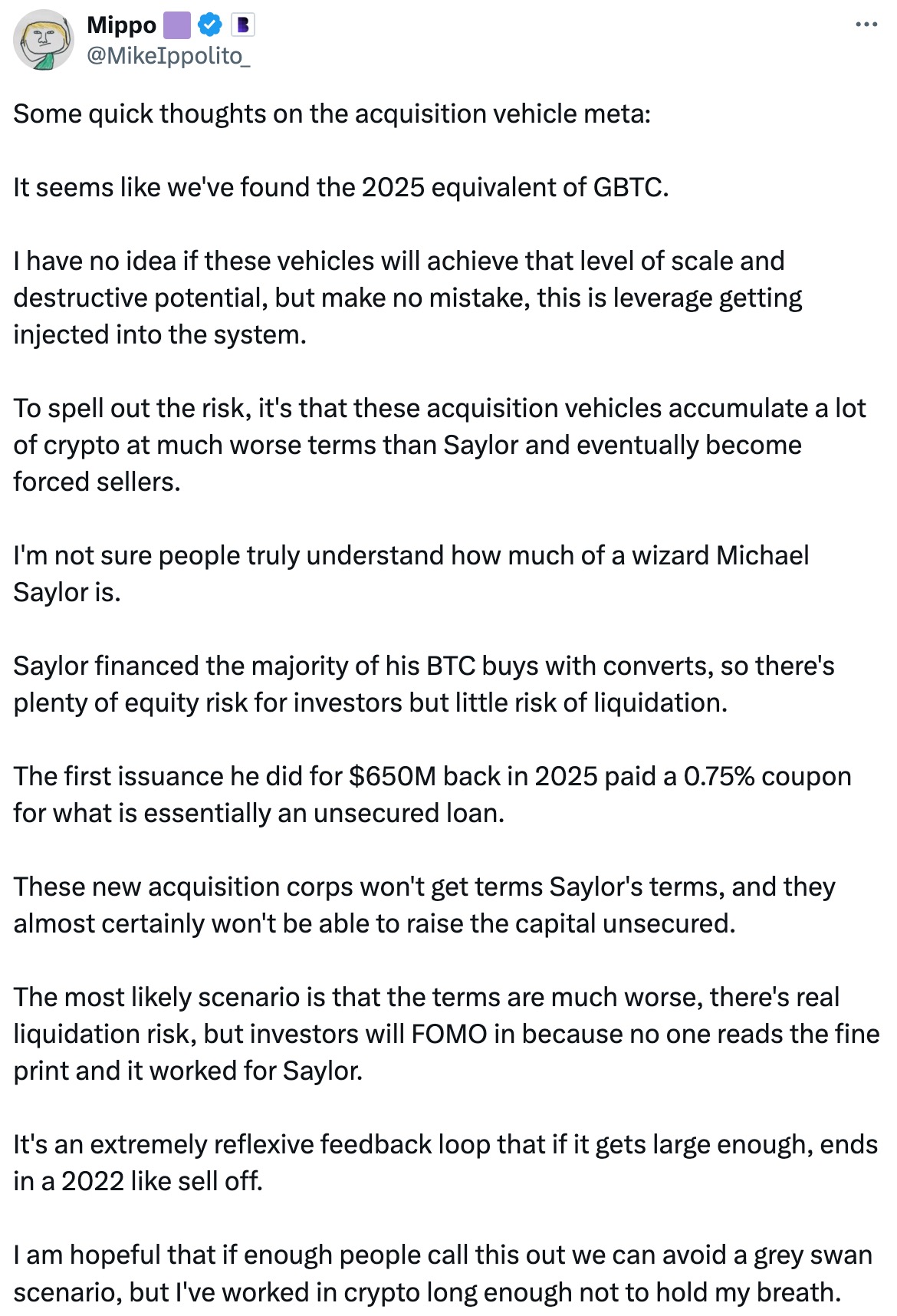 许多市场分析师目前已对上市公司大举配置加密资产的风险保持高度警惕。渣打银行球数字资产研究主管 Geoffrey Kendrick 测算,若比特币价格回落至 9 万美元下方,半数企业的比特币储备将面临浮亏;Blockworks 联合创始人Mike Ippolito 则将这类资金管理公司比作「2025 年的 GBTC」,警示其可能带来的系统性风险。他指出,与 MicroStrategy 创始人 Michael Saylor 能够以 0.75% 的超低利率发行无担保可转债不同,这些后来者很难获得同等优惠的融资条件,反而面临着真实的清算风险。类似的,Castle Island Ventures 合伙人 Nic Carter 也将此与曾经溢价交易的 GBTC 相类比,警告当市场情绪逆转时,可能重演 2022 年由 GBTC 折价引发的连锁暴雷事件。